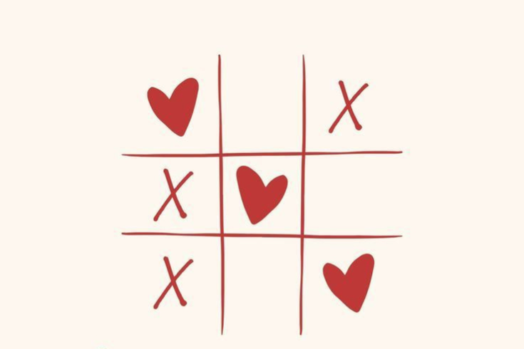 Morpion symbolisant la rencontre amoureuse avec un alignement de cœurs, illustrant l’idée qu’il n’est pas nécessaire d’être parfait pour aimer.